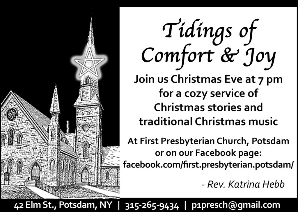 Sunday, December 21, Rev. Katrina Hebb will lead an in-person worship service in the newly-renovated Potsdam Presbyterian Sanctuary accompanied by Music Director Dr. Keillor Kastella on piano. Worship will be followed by a coffee hour in the Community Center.